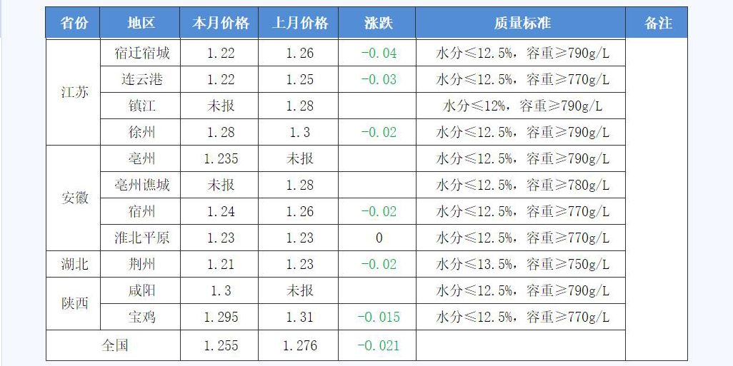 本月國(guó)內(nèi)小麥價(jià)格滯漲回落。截止月末,全國(guó)小麥平均價(jià)格數(shù) 為1.255元/斤,較上月跌0.021元/斤,國(guó)內(nèi)主產(chǎn)區(qū)面粉企業(yè)小麥?zhǔn)?/span>購價(jià)在1.21-1.30元/斤,較上月波動(dòng)0.005-0.04元/斤。