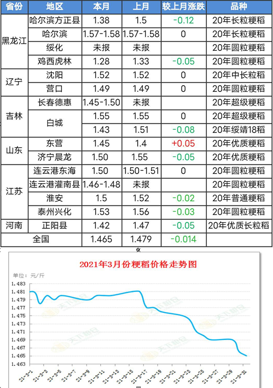 3月1日-3月31日,國(guó)內(nèi)粳稻價(jià)格滯漲回落。截至月底,國(guó)內(nèi)粳稻價(jià)格指數(shù)為1.465元/斤,較上個(gè)月跌0.014元/斤。蘇皖地區(qū)及東北地區(qū)粳稻收購價(jià)集中在1.25-1.58元/斤,大部分地區(qū)較上月跌0.02-0.12元/斤,僅個(gè)別地區(qū)漲0.05元/斤。各地價(jià)格月度變化 情況如下表: