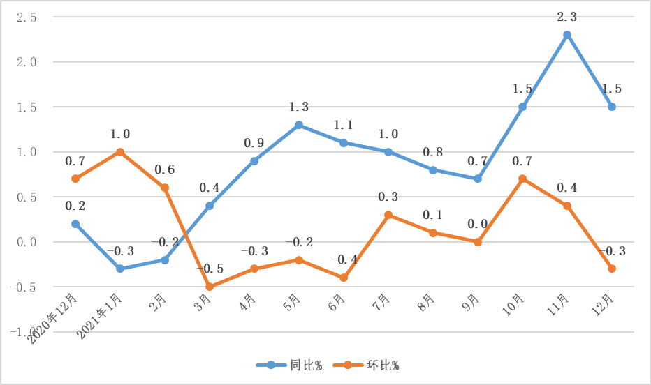 2021年12月份,全國居民消費價格同比上漲1.5%。其中,城市上漲1.6%,農(nóng)村上漲1.2%;食品價格下降1.2%,非食品價格上漲2.1%;消費品價格上漲1.5%,服務(wù)價格上漲1.5%。