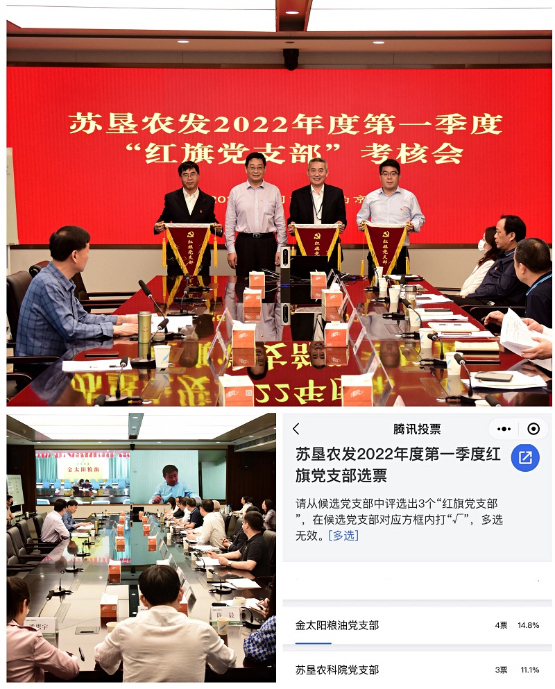 會議以視頻形式召開,主會場設(shè)在南京蘇墾大廈,蘇州蘇墾、金太陽黨支部各設(shè)置了1個分會場,9位黨支部書記分別就一季度支部工作開展情況進行了述職。本次會議在民主互評環(huán)節(jié)創(chuàng)新了投票形式,采用騰訊投票小程序進行線上匿名投票,投票結(jié)果實時投屏在主會場大屏幕,全過程公開透明。經(jīng)過了激烈的兩輪角逐之后,綜合評選出蘇墾米業(yè)總部黨支部、總部第一黨支部、大華種業(yè)機關(guān)黨支部為第一季度“紅旗黨支部”。王立新為紅旗黨支部授旗。