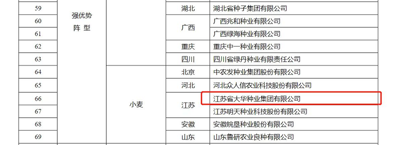 為貫徹黨中央、國務(wù)院種業(yè)振興決策部署,深入實施種業(yè)企業(yè)扶優(yōu)行動,近日農(nóng)業(yè)農(nóng)村部辦公廳印發(fā)《關(guān)于扶持國家種業(yè)陣型企業(yè)發(fā)展的通知》,根據(jù)企業(yè)規(guī)模、創(chuàng)新能力和發(fā)展?jié)摿Φ汝P(guān)鍵指標(biāo),從全國3萬余家種業(yè)企業(yè)中遴選了69家農(nóng)作物、86家畜禽、121家水產(chǎn)種業(yè)企業(yè)機構(gòu),集中力量構(gòu)建“破難題、補短板、強優(yōu)勢”國家種業(yè)企業(yè)陣型,加快打造種業(yè)振興骨干力量。江蘇省大華種業(yè)集團(tuán)有限公司入選“國家農(nóng)作物種業(yè)陣型企業(yè)·強優(yōu)勢陣型(小麥)”。