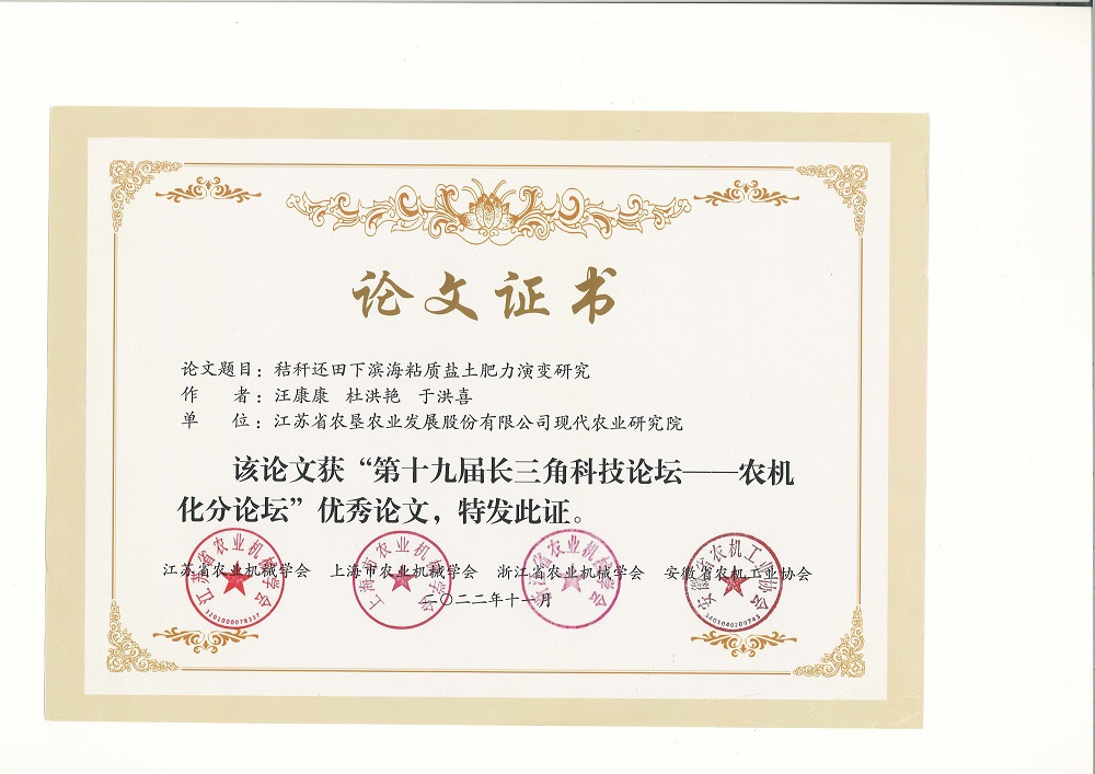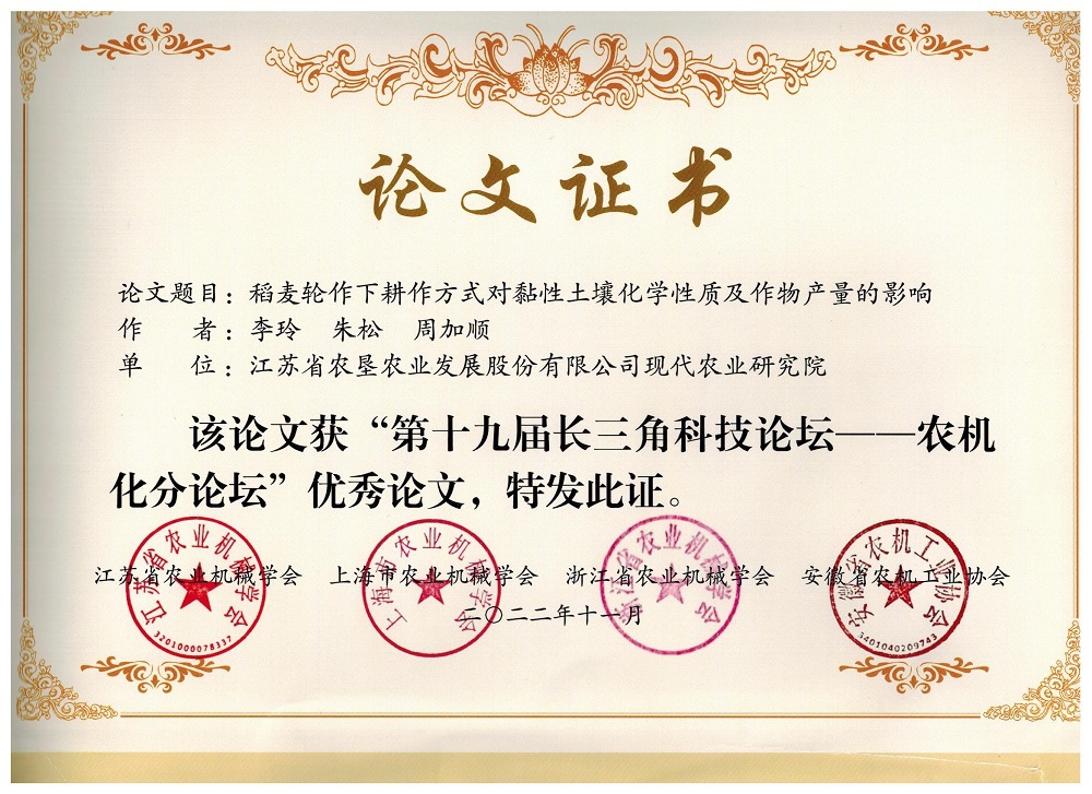 本次論壇共收錄論文47篇,經(jīng)“三省一市”學(xué)(協(xié))會(huì)推薦、評(píng)審,共評(píng)出優(yōu)秀論文13篇,其中江蘇省5篇。蘇墾農(nóng)科院首次參加該獎(jiǎng)評(píng)選,報(bào)評(píng)的2篇論文都獲得優(yōu)秀論文獎(jiǎng)榮譽(yù),這是蘇墾農(nóng)科院多年來潛心農(nóng)機(jī)農(nóng)藝相結(jié)合的研究結(jié)果。蘇墾農(nóng)科院將以此次獲獎(jiǎng)為契機(jī),持續(xù)加大農(nóng)機(jī)農(nóng)藝相融合的科研攻關(guān)力度,為蘇墾農(nóng)發(fā)一體化擴(kuò)量發(fā)展提供科技支撐。