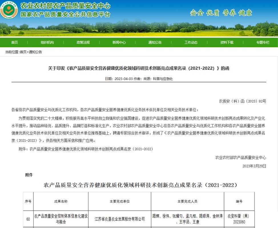 2023年4月3日,蘇墾農(nóng)發(fā)“農(nóng)產(chǎn)品質(zhì)量安全控制體系信息化建設(shè)與融合”創(chuàng)新成果成功入選農(nóng)業(yè)農(nóng)村部《農(nóng)產(chǎn)品質(zhì)量安全營養(yǎng)健康優(yōu)質(zhì)化領(lǐng)域科研技術(shù)創(chuàng)新亮點(diǎn)成果名錄(2021-2022)》。據(jù)悉,該目錄每2年評審一次,全國63個(gè)成果、江蘇省3個(gè)成果入選,蘇墾農(nóng)發(fā)首次入選該名錄,是省內(nèi)唯一一個(gè)入圍的企業(yè)單位。