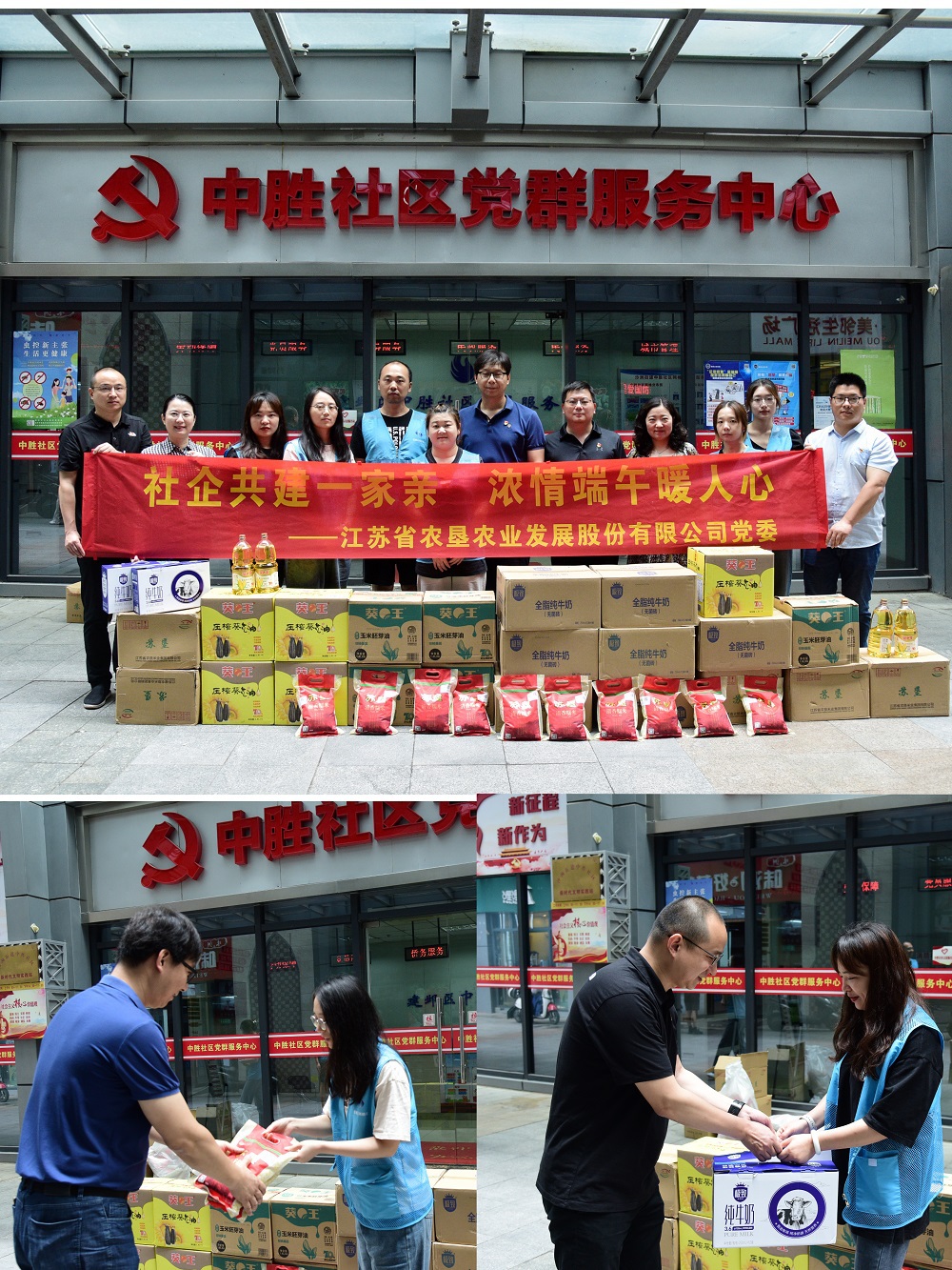 在端午節(jié)來臨前夕,為弘揚(yáng)中華傳統(tǒng)美德,加大與所轄社區(qū)共駐共建力度,營(yíng)造文明和諧的節(jié)日氛圍,6月21日,蘇墾農(nóng)發(fā)到建鄴區(qū)沙洲街道中勝社區(qū)開展“社企共建一家親 濃情端午暖人心”慰問活動(dòng),給社區(qū)一線網(wǎng)格員們送去慰問品和節(jié)日祝福。