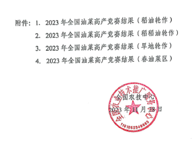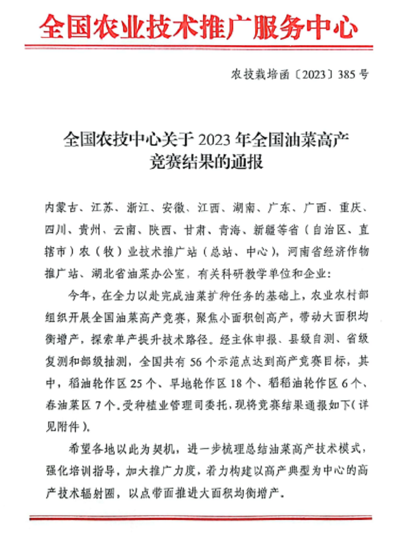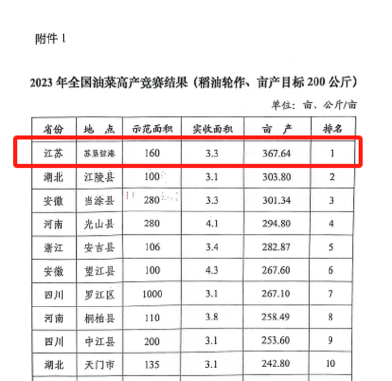 近日,農(nóng)業(yè)農(nóng)村部全國農(nóng)業(yè)技術推廣服務中心公布了2023年全國油菜高產(chǎn)競賽結果,蘇墾農(nóng)發(fā)弶港分公司百畝攻關方以畝產(chǎn)367.64公斤刷新全國稻油輪作油菜高產(chǎn)記錄,較原紀錄提高43.77公斤,榮獲本次全國油菜高產(chǎn)競賽全組別第一名。