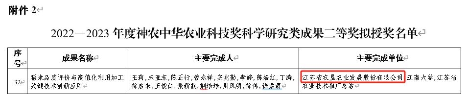 近日,2022—2023年度神農(nóng)中華農(nóng)業(yè)科技獎189項擬授獎成果公示,江蘇省農(nóng)墾農(nóng)業(yè)發(fā)展股份有限公司作為第一完成單位的“稻米品質(zhì)評價與高值話利用加工關(guān)鍵技術(shù)創(chuàng)新應(yīng)用”項目成果成功入圍“2022—2023年度神農(nóng)中華農(nóng)業(yè)科技獎科學(xué)研究類成果二等獎擬授獎名單”。