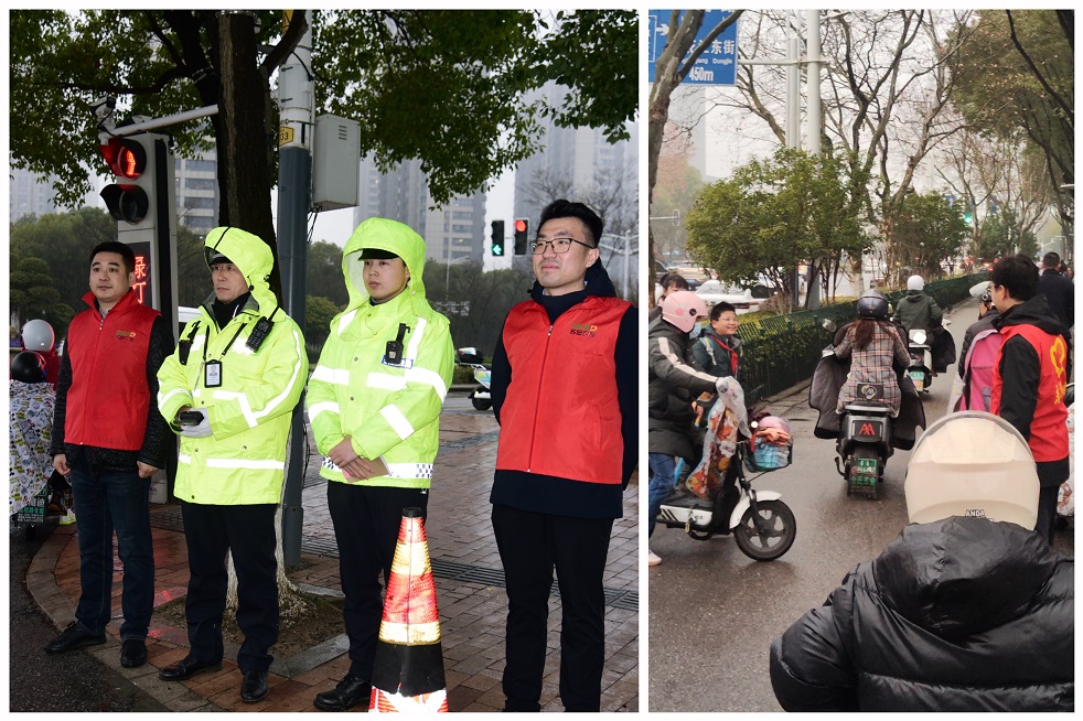 用心“護學(xué)”,為愛“站崗”。每到上學(xué)、放學(xué)高峰期,南師大附屬中學(xué)新城小學(xué)、金陵中學(xué)河西分校小學(xué)部的校門口都很擁堵,車流量大,來往人員眾多?;顒赢?dāng)日,志愿者們不畏嚴(yán)寒早早來到校園門口,開展“護學(xué)崗”志愿服務(wù),疏導(dǎo)學(xué)校周邊的車輛和人員,提醒接送孩子的家長不要扎堆,引導(dǎo)放學(xué)的孩子到安全區(qū)域行走,時刻提醒騎電動車、摩托車的家長注意雨天行車安全,確保學(xué)校周邊交通安全有序,為師生、家長的安全出行筑起一道“綠色”通道。