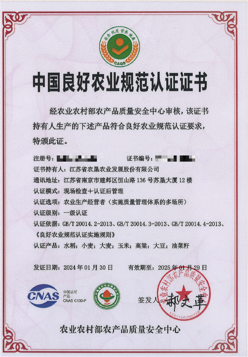 近日,蘇墾農(nóng)發(fā)20個(gè)生產(chǎn)基地的水稻、小麥、大麥、玉米、大豆、油菜、高粱等7種作物通過全國良好農(nóng)業(yè)規(guī)范(GAP)一級(jí)認(rèn)證,是全國單體規(guī)模最大的一級(jí)認(rèn)證單位。