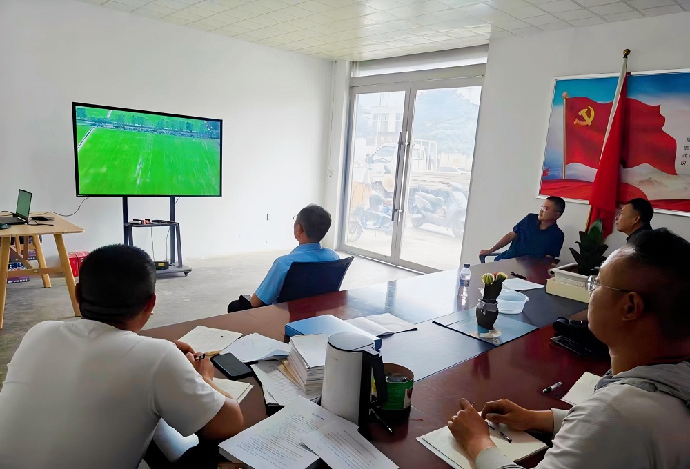 在外拓基地張灣生產(chǎn)區(qū)會議室,生產(chǎn)區(qū)管理人員和基地管理辦公室技術(shù)人員正在通過大疆司空系統(tǒng)對無人機(jī)巡田過程進(jìn)行現(xiàn)場直播,操控人員在田間按照提前規(guī)劃好的航線操控?zé)o人機(jī),生產(chǎn)區(qū)管理人員在會議室通過投屏進(jìn)行現(xiàn)場觀看。觀看過程中,農(nóng)業(yè)生產(chǎn)技術(shù)人員將田間管理不足之處一一指出,讓生產(chǎn)區(qū)管理人員更加直觀、充分的了解到哪些地方還需要改進(jìn)。