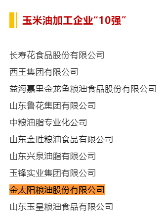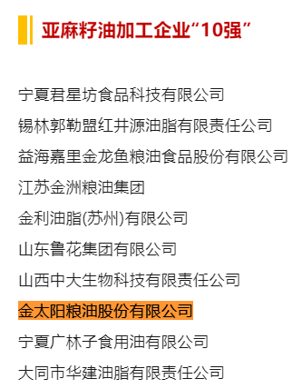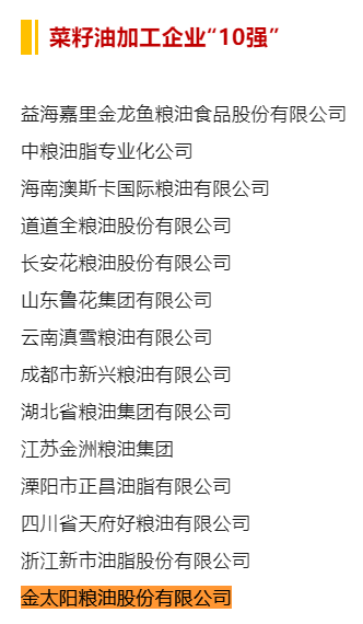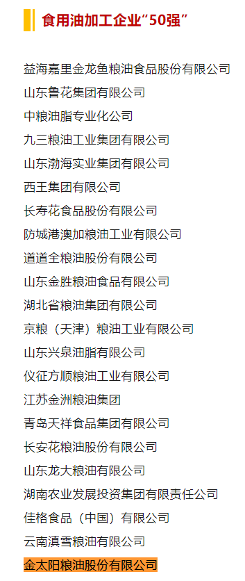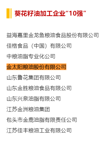 近日,中國糧食行業(yè)協(xié)會根據(jù)《關(guān)于進行2024年度重點糧油企業(yè)和各省糧油加工業(yè)專項調(diào)查的通知》(中糧協(xié)〔2024〕2號),組織行業(yè)專家開展了2023年度重點糧油企業(yè)專項調(diào)查,按照產(chǎn)品銷售收入、產(chǎn)量、產(chǎn)能、利稅、利潤等指標綜合審定,公示了2023年度重點糧油企業(yè)專項調(diào)查結(jié)果。金太陽糧油股份有限公司再度入選食用油加工企業(yè)“50強”、玉米油加工企業(yè)“10強”、稻米油加工企業(yè)“10強”、葵花籽油加工企業(yè)“10強”、亞麻籽油加工企業(yè)“10強”等5項榜單,首次入選菜籽油加工企業(yè)“10強”榜單。
